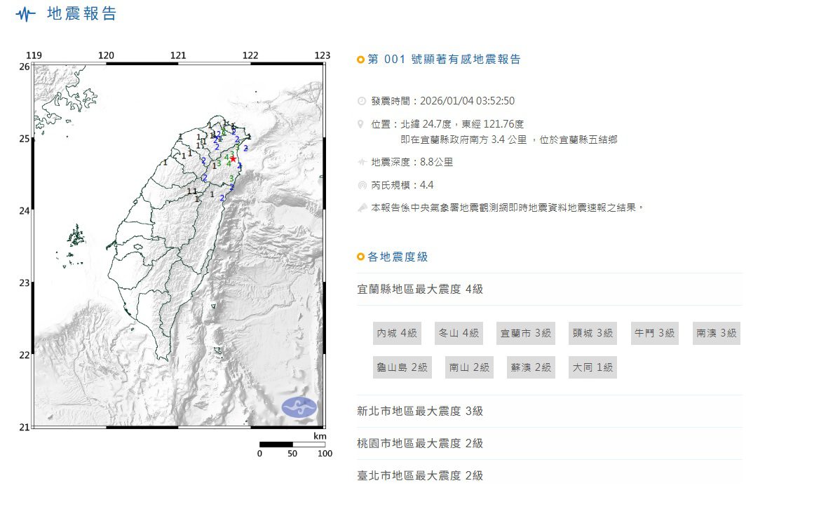 生活中心/綜合報導 4日上午3:52左右,發生芮氏