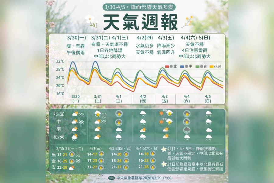 生活中心/綜合報導 中央氣象署公布未來一周天氣重點