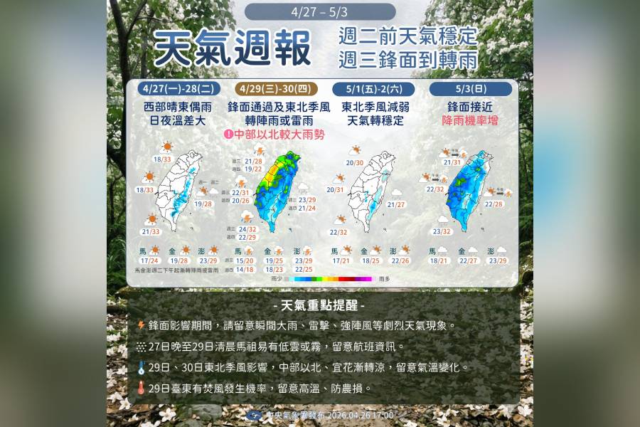 生活中心/綜合報導 中央氣象署公布未來一周天氣重點