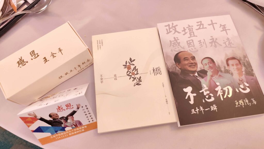 為表達感謝之意,籌備單位特別準備鶯歌燒製作的紀念「敬杯」,以及題為《不忘初心・五十年一瞬》的紀念小冊,贈送給與會來賓,象徵對長年支持者的回饋,也為王金平半世紀政治歷程留下具體紀錄。