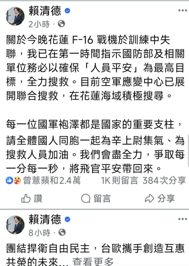 事故通報後,國防部立即啟動跨部會搜救機制,指揮空軍、空勤總隊與海巡署展開聯合行動。軍方已派遣C-130運輸機及海鷗直升機出海搜尋,空勤總隊亦配合投入空中救援能量;海巡署方面,則由蘇澳、花蓮及台東等地海巡隊緊急增派多艘100噸級巡防艇,全速趕往疑似落海區域展開地毯式搜尋;稍早賴清德總統也在臉書表示,今晚花蓮F-16戰機於訓練中失聯,他在第一時間指示國防部及相關單位務必以確保「人員平安」為最高目標,全力搜救。目前空軍應變中心已展開聯合搜救,在花蓮海域積極搜尋。每一位國軍袍澤都是國家的重要支柱,請全體國人同胞一起為辛上尉集氣、為搜救人員加油。我們會盡全力,爭取每一分每一秒,將飛官平安帶回來。。